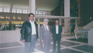 الشيخ مُحَمَّد المُحَمَّد الكَسْنَزان في إحدى زياراته اليومية إلى المكتبة البريطانية في لندن، وعلى يمينه نجله الأكبر ووكليه العام الشيخ نهرو، وعلى يساره مرافقه الحاج لطيف (منتصف 2000)