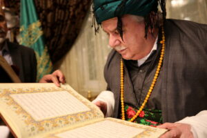 الشيخ مُحَمَّد المُحَمَّد الكَسْنَزان يقبل المصحف في تكية عمان، الأردن في ليلة الاحتفال بمولد الشيخ عبد القادر الگيلاني (20 كانون الأوّل 2018)