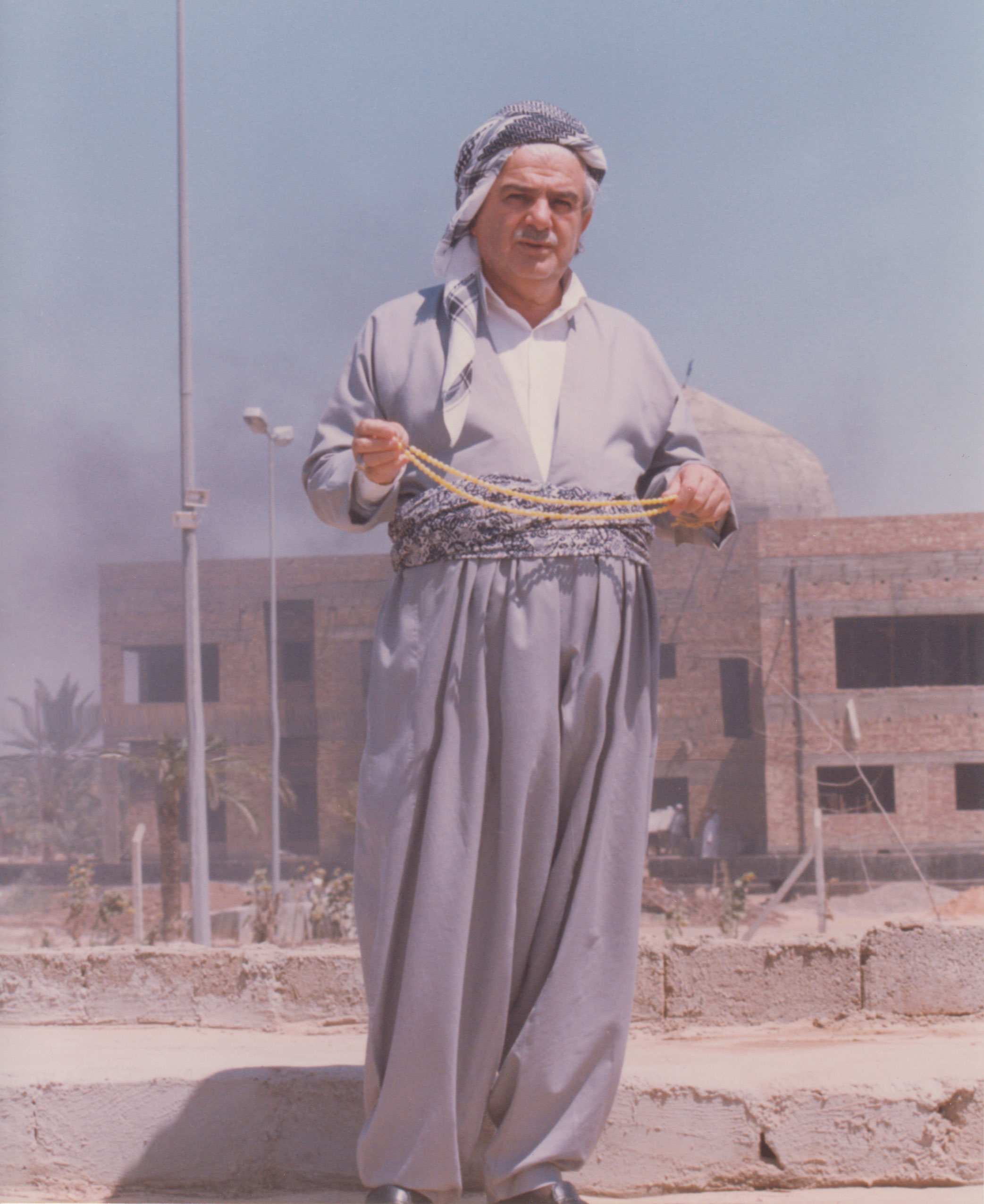 الشيخ مُحَمَّد المُحَمَّد الكَسْنَزان وخلفه بناية تقوم مكانها اليوم بناية أحد أقسام كلية السلام الجامعة (منتصف التسعينيات)