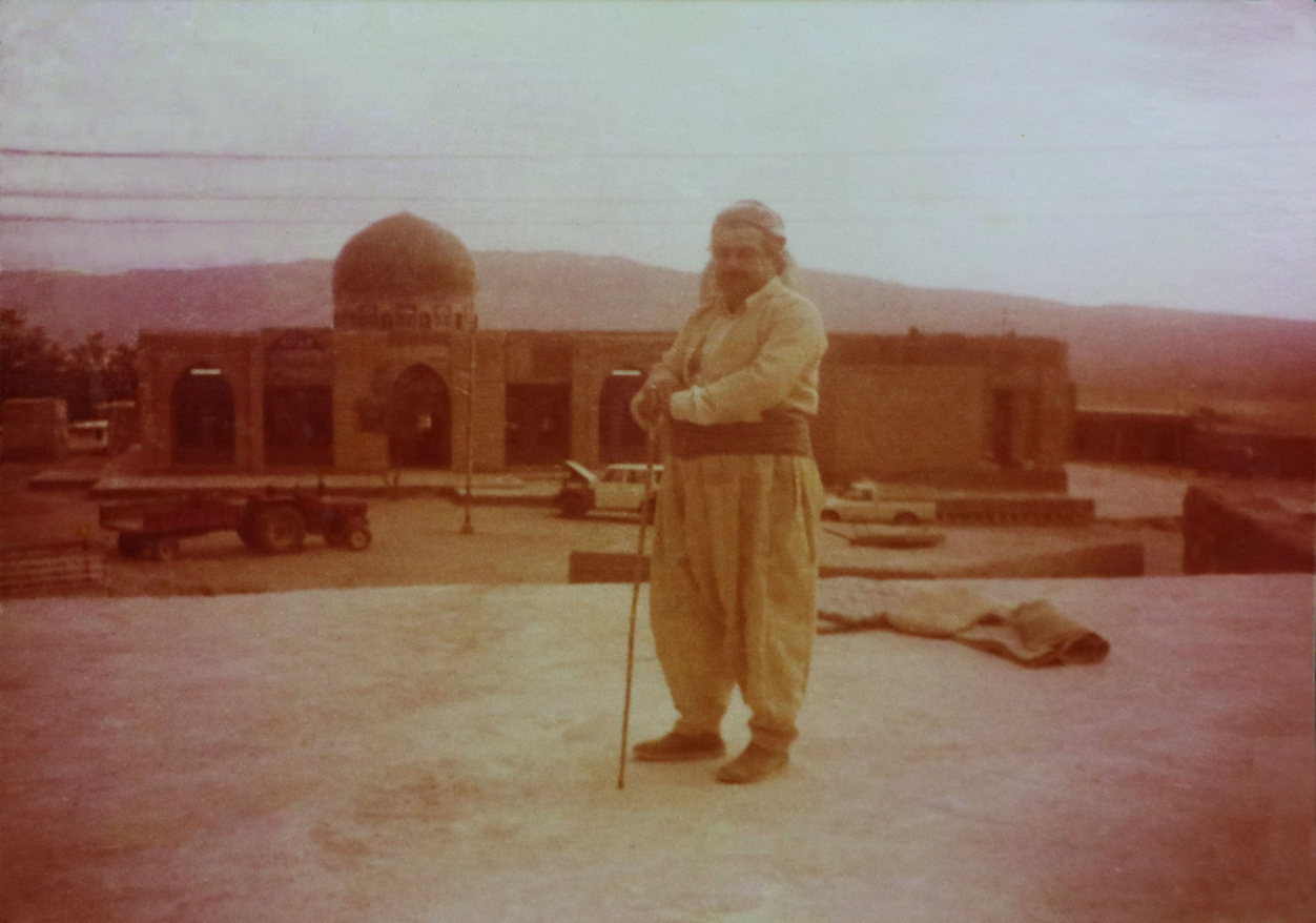 الشيخ مُحَمَّد المُحَمَّد الكَسْنَزان أمام روضة مشايخ الطريقة الكَسْنَزانيّة في كَرْبْچْنَه أثناء تجديدها وتوسيعها (بداية الثمانينيات)